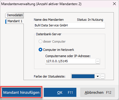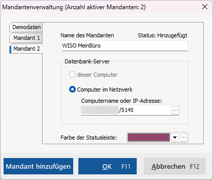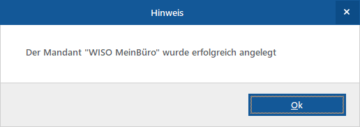 Mit Klick auf "OK" wird der Mandant im Programm und somit auch die Datenbank im Installationsverzeichnis erstellt. Nach ein paar Sekunden erscheint der Hinweis, dass dein Mandant erfolgreich angelegt wurde.