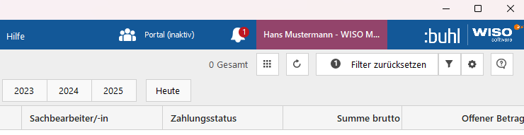 Nachdem die Steuereinstellungen sowie die Kontenpläne geladen wurden, siehst du rechts oben in der Menüleiste zunächst den Namen des angemeldeten Benutzers und danach den Firmennamen. Die Farbe kannst du jederzeit über die Mandantenverwaltung festlegen.