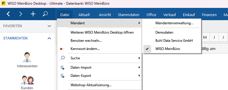 In der Menüleiste kannst du jederzeit über "Datei > Mandant" in die gewünschte Datenbank wechseln, indem du einfach auf den Namen klickst.