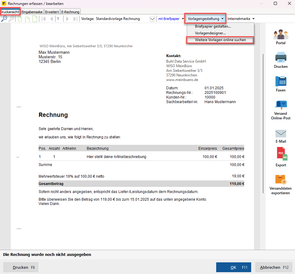 Öffne zunächst einen beliebigen Vorgang in der "Druckansicht". In unserem Beispiel erklären wir das anhand einer Rechnung, du kannst die Vorgehensweise aber für jede Vorgangsart anwenden. Über "Vorlagengestaltung > Weitere Vorlagen online suchen" stehen dir dann die kostenlosen Online-Vorlagen zur Verfügung.