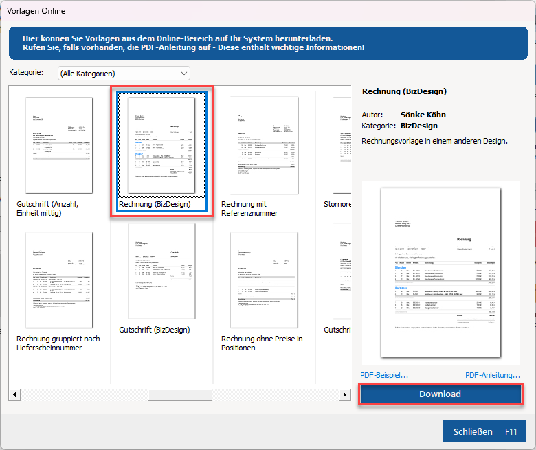 In unserem Beispiel wählen wir die Vorlage "Rechnung (BizDesign)" aus und klicken auf den Button "Download". Unterhalb der Vorschau kannst du dir außerdem das "PDF-Beispiel" sowie die "PDF-Anleitung" anzeigen lassen.