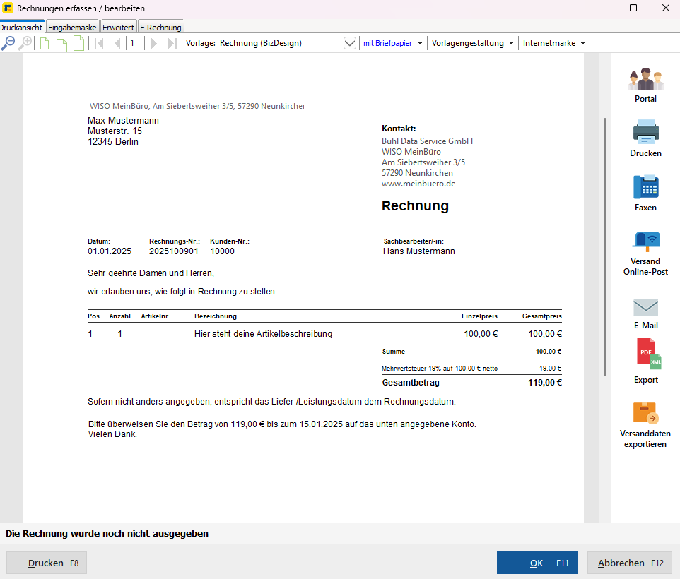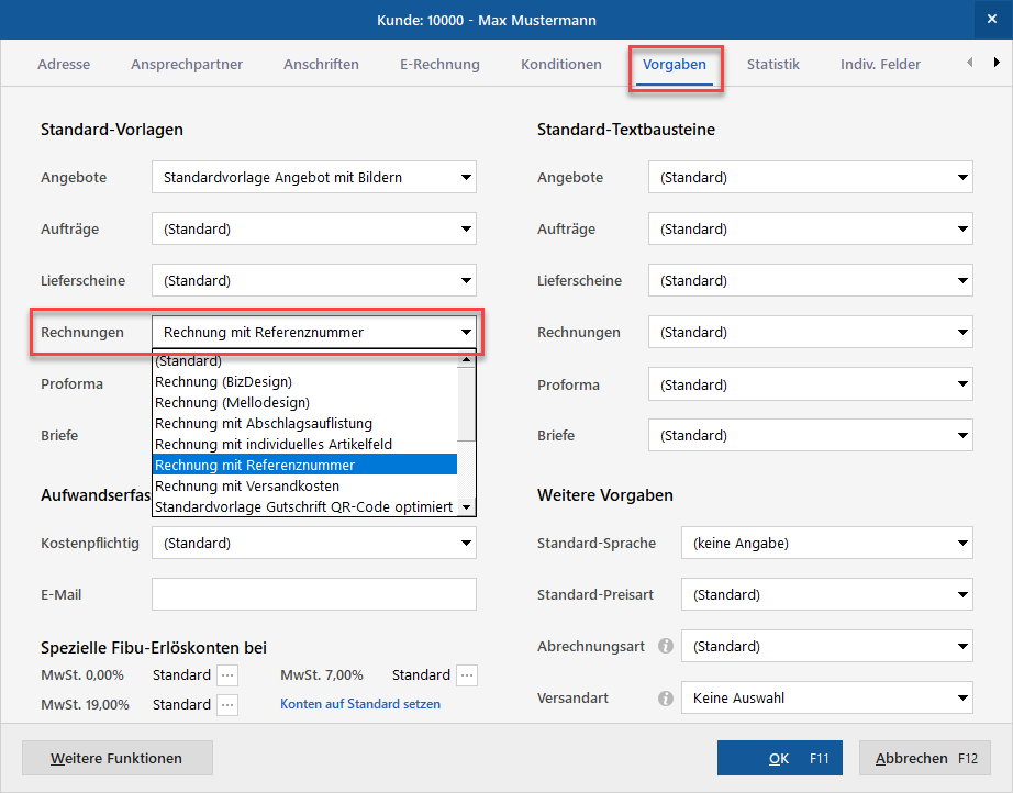 Speichere deine Änderungen über den Button "OK". Wählst du diesen Kunden nun in einer neuen Rechnung aus, wird automatisch auch die Vorlage entsprechend deiner Vorgaben angepasst.